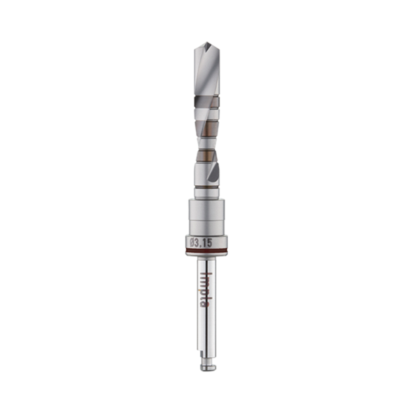 Die Bohrtiefe im Knochen wird beim Bohren über die Tiefenmarkierungsringe am Bohrer kontrolliert. Den Bohrer mit Durchmesser 3,15 mm und 4,25 mm gibt es in einer kurzen Ausführung für die Anwendung in der Molaren-Region.