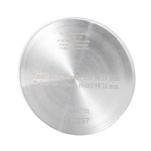Bei den Tizian Blank NEM handelt es sich um eine biokompatible NEM-Fräslegierung auf CoCr-Basis. Sie enthält kein Nickel oder Beryllium.