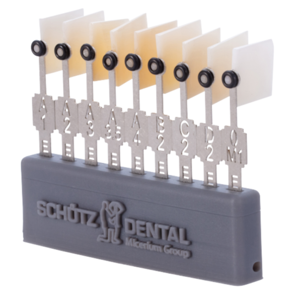 Die Shadeguides und Farbkeile bieten eine präzise Farbreferenz, indem sie die tatsächlichen Blank-Farben zeigen. Bestimmen Sie die Zahnfarbe bereits in derZahnarztpraxis mit dem Shadeguide und sichern Sie eine konsistente Farbübereinstimmung während des gesamten Fertigungsprozesses mit den Farbkeilen.